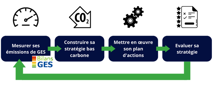 Le Bilan GES une première étape essentielle pour s’engager dans un processus bas Carbone. Le processus bas carbone s’articule autour des étapes suivantes :