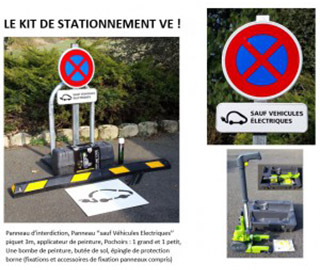 Le poteau et les deux panneaux réglementaires, il est possible d’ajouter « Sauf Véhicules électriques en cours de recharge », ce qui est plus explicite que le simple fait de mettre sauf véhicules électriques, les conducteurs comprenant alors que c’est une place réservée aux véhicules électrique, le code de la route ne détaillant pas cet aspect ! Deux pochoirs, un grand pour le centre de la place et deux petits pour le bord de la place Chaque produit du KIT peut être commandé séparément ! Il existe également tous les autres panneaux pour tout type de place. |