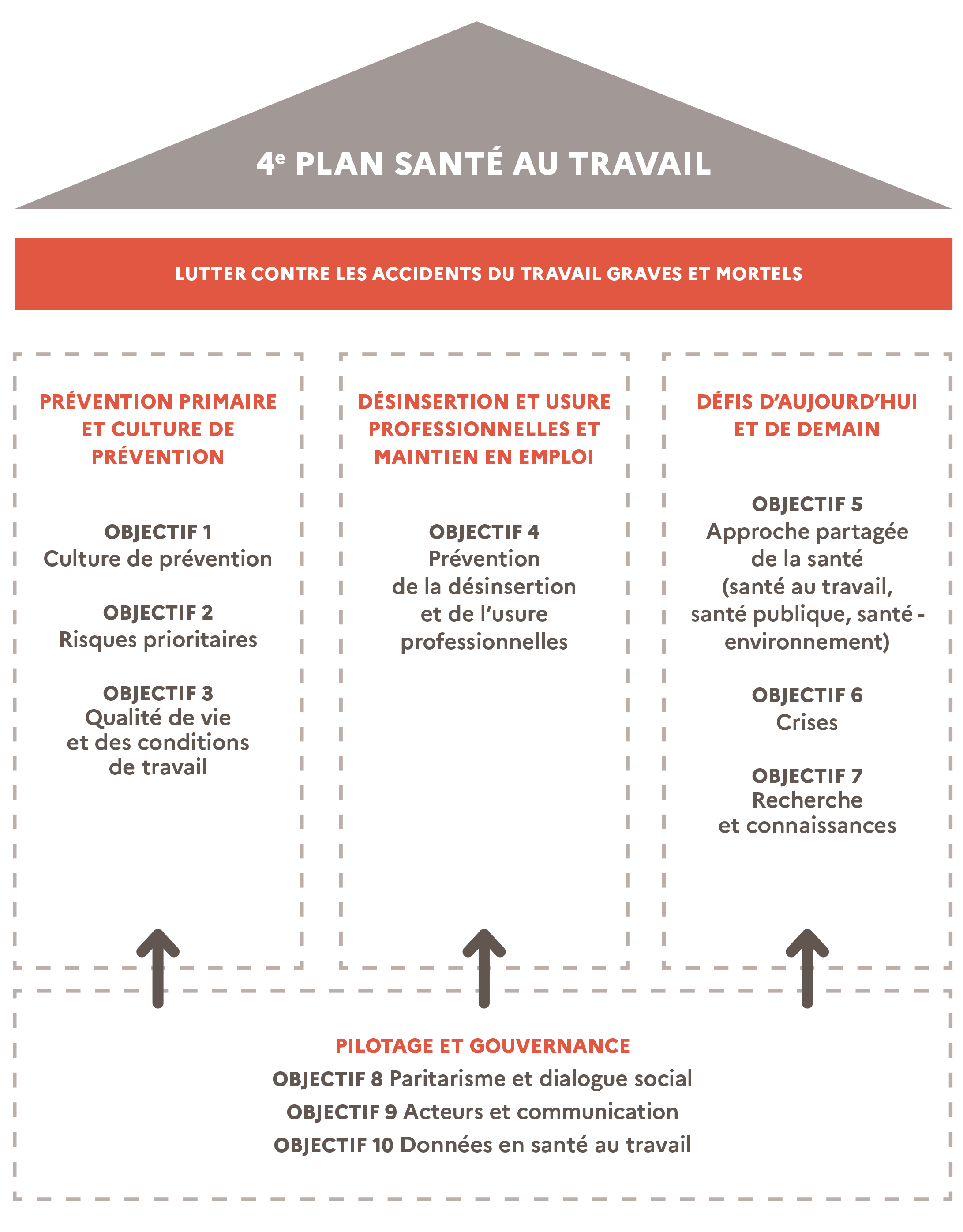 Il réaffirme les fondamentaux de la prévention de la santé au travail que sont la logique de prévention par rapport à la logique de réparation, la promotion d’une approche positive de la santé, le dialogue social autour des conditions de travail, la prévention de la désinsertion professionnelle et l’accompagnement des salariés vulnérables.