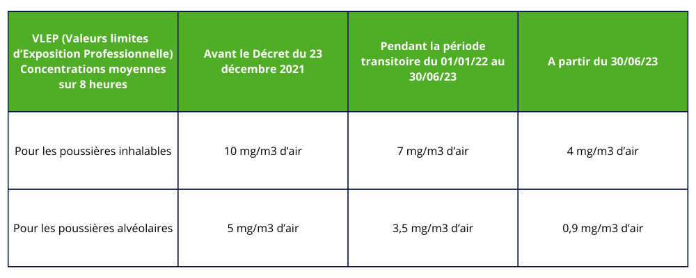 Une phase transitoire est prévue du 1er janvier 2022 au 30 juin 2023, pendant laquelle les concentrations moyennes en poussières inhalables et alvéolaires à respecter seront respectivement de 7 et 3,5 milligrammes par mètre cube d'air.