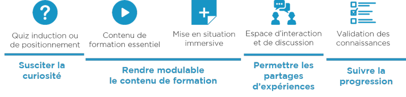 Nous travaillons sur des approches pédagogiques innovantes, en proposant par exemple des quiz de positionnement en début de module, ou des parcours modulables en fonction du temps que l'apprenant souhaite consacrer à la formation.