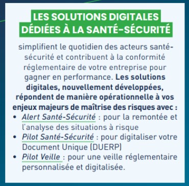 - Pilot Santé-Sécurité conçue pour gagner en efficacité dans l’évaluation des risques professionnels et l’élaboration du Document Unique d’Exposition aux Risques Professionnels : votre DUERP et ses mises à jour sont facilités et vous bénéficiez de l’accompagnement d’un consultant.